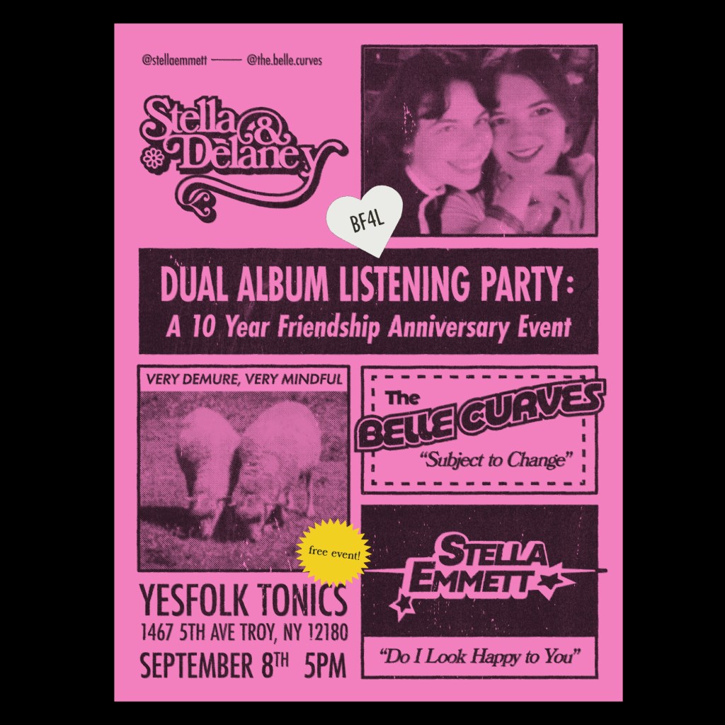 September 8th in Troy is our listening party!!! my friend Stella and I have been friends for ten years as of this fall (we met at college orientation and become roommates for our whole time at Purchase) and we both have new records to put out and we both love Troy so we thought it would be so perfect and delightful to have a dual listening party to celebrate all of that!!! Starting at 5pm at Yesfolk Tonics. cool ass poster by Lexie Frisbie :))))